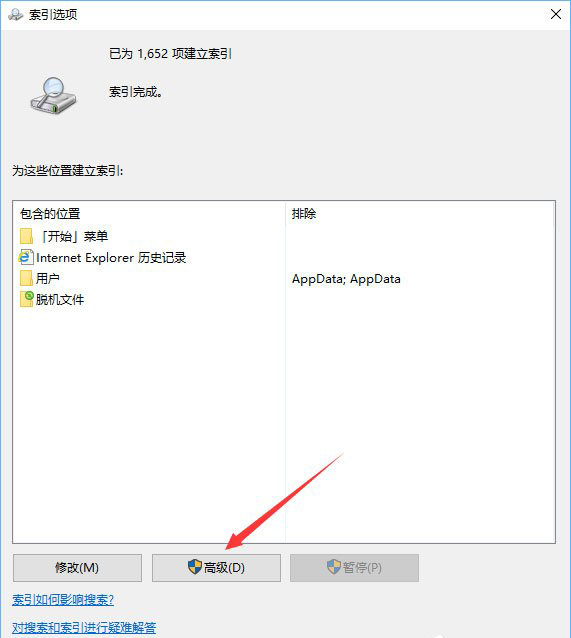 1、在Cortana搜索框中输入【索引选项】,打开索引选项窗口;