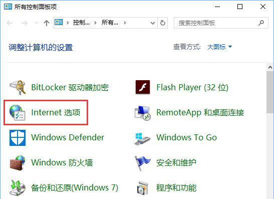 2、在控制面板中,修改【查看方式】为大图标,点击【internet 选项】;