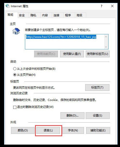 3、之后,在internet 选项下点击【语言】;