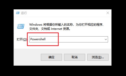 2、在运行窗口中,输入“Powershell”,按下“确定”运行。