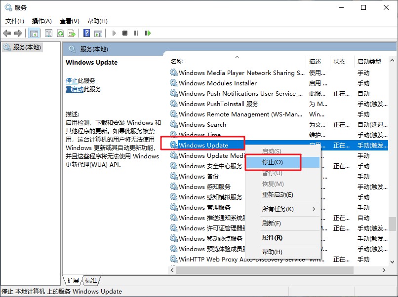 3、在“Windows Update”服务上右击,然后单击“停止”。