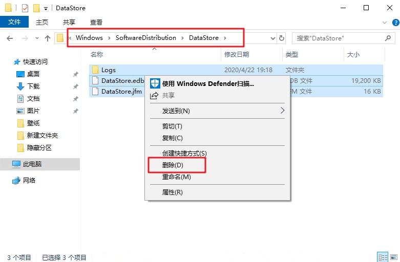 2、打开DataStore文件夹,再删除里面所有文件和文件夹,如果提示需要管理员权限,点击“继续”。
