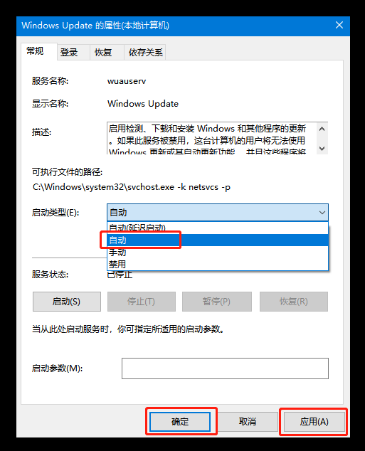 3、进入属性页面后,将启动类型更改为“自动”即可,点击“应用”并“确定”即可