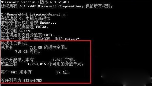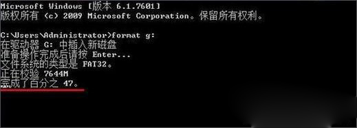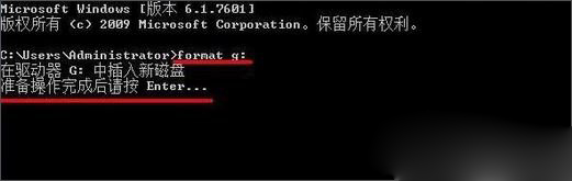 2、随后,输入【format g:】(其中g为当前插在电脑上的U盘盘符),按回车键执行,此时提示准备操作完成后按回车键继续操作提示,继续按回车即可;