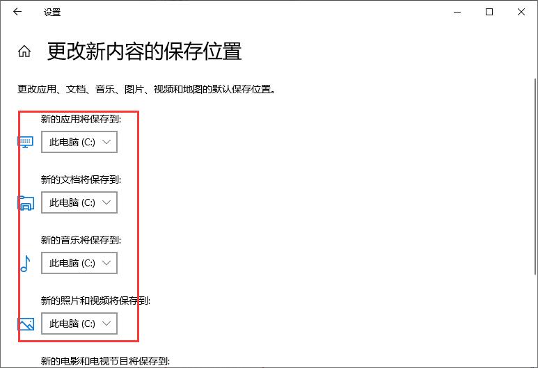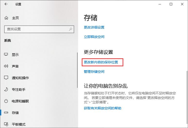 4、接着,下滑存储页面,找到并打开“更改新内容的保存位置”;如图所示: