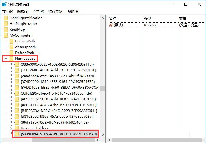 【HKEY_LOCAL_MACHINE\SOFTWARE\Microsoft\Windows\CurrentVersion\Explorer\MyComputer\NameSpace】,新建项,命名为【{5399E694-6CE5-4D6C-8FCE-1D8870FDCBA0}】