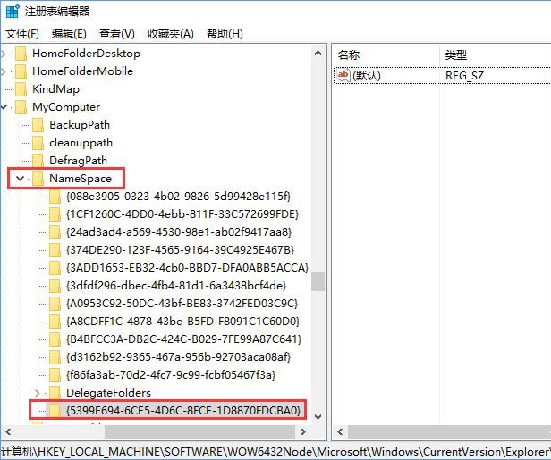 【HKEY_LOCAL_MACHINE\SOFTWARE\Wow6432Node\Microsoft\Windows\CurrentVersion\Explorer\MyComputer\NameSpace】,新建项,命名为【{5399E694-6CE5-4D6C-8FCE-1D8870FDCBA0}】