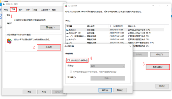 操作步骤:磁盘C右键进入属性,然后进入工具--对驱动器进行优化和碎片整理--优化--优化驱动器--启用,确定没有勾选“按计划运行”即可。