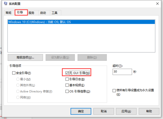 操作步骤:同时按下键盘快捷键Win+R,打开运行窗口msconfig 确定,进入系统配置界面,点击引导,找到去掉勾选“勾上无GUI引导”,确定。