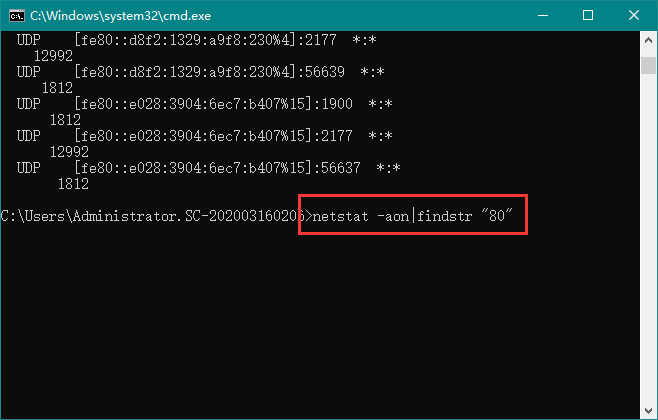 3、如果想要查找特定的端口可以输入命令“netstat -aon|findstr "端口号"”,例如“netstat -aon|findstr "80"”即为查找端口号为80的信息: