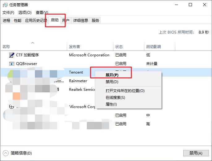 2、 弹出对话框后,点击切换“启动”选项卡,将不必要的开机启动项右键“禁用”(除杀毒软件外,其他都可以禁用)。