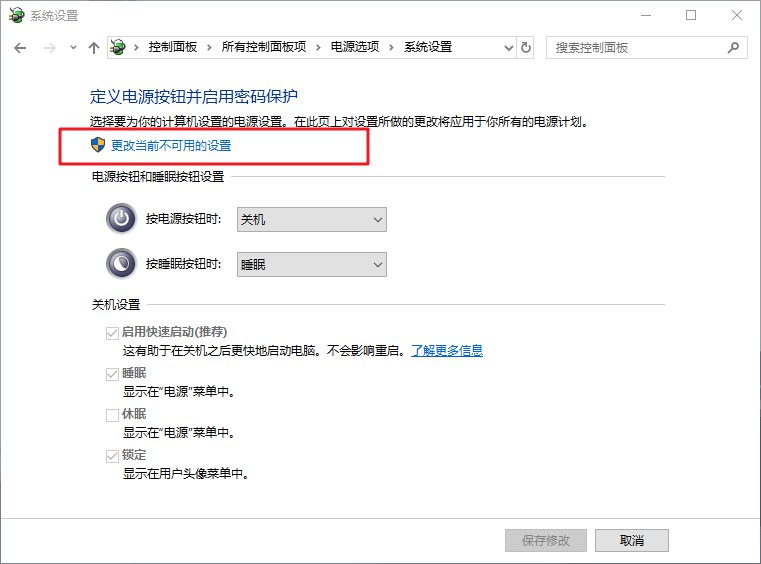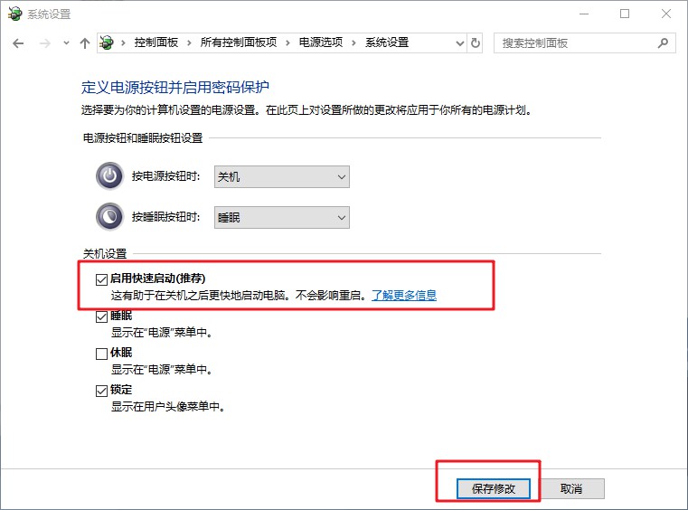 4、 最后,勾选“启用快速启动”并点击“保存修改”即可