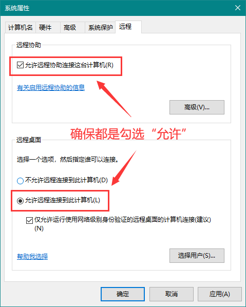 2、打开高级系统设置后,切换到远程选项卡,请确保远程协助中勾选允许远程协助连接这台计算机。在远程桌面上请确保勾选允许远程连接到此计算机。