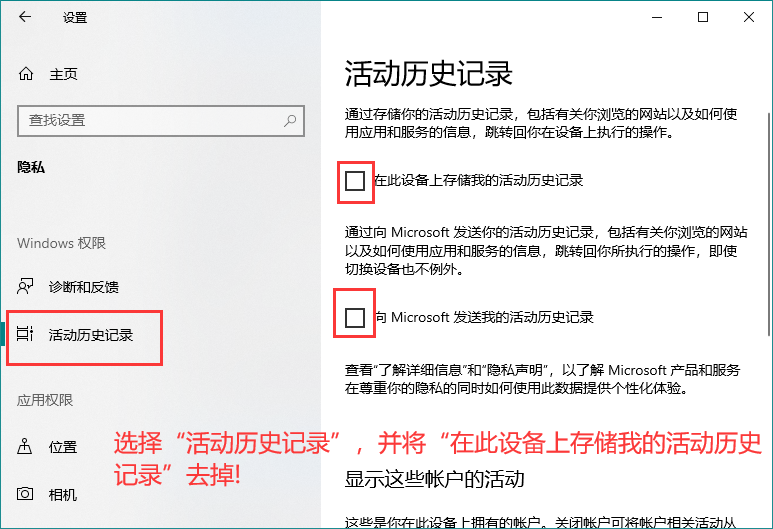 2、在这个界面中取消勾选“允许Windows从此电脑中收集我的活动以及从此电脑同步到云”。