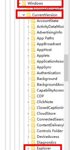 3、依次再打开 Microsoft—>Windows—>CurrentVersion—>Explorer。