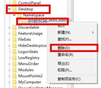 4、找到文件夹 Desktop点击下拉再点击“NameSpace”右击下面的文件点击“删除”。