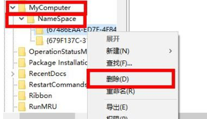 5、在找到文件夹 MyComputer点击下拉再点击“NameSpace”右击下面的文件点击“删除”即可。