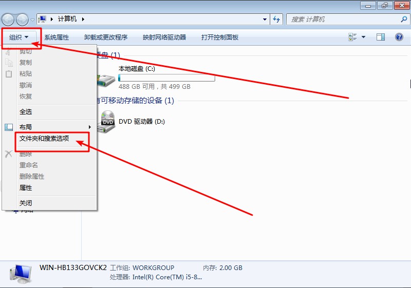 1、 双击计算机图标,如图所示,点击“组织”,选择“文件夹和搜索选项”