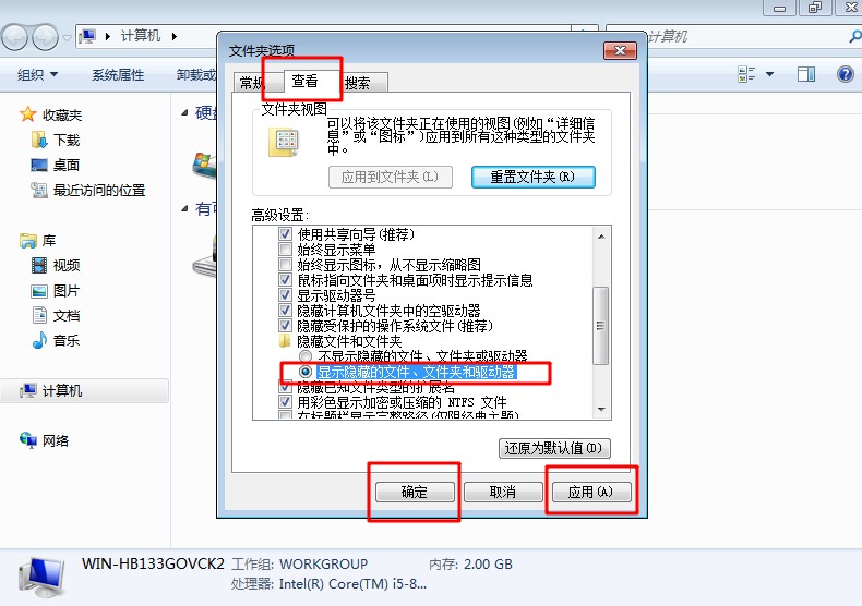 2、 在文件夹选项对话框中,选择“查看”,找到并点击选择 “显示隐藏的文件、文件夹和驱动器”,点“应用”-“确定”