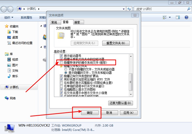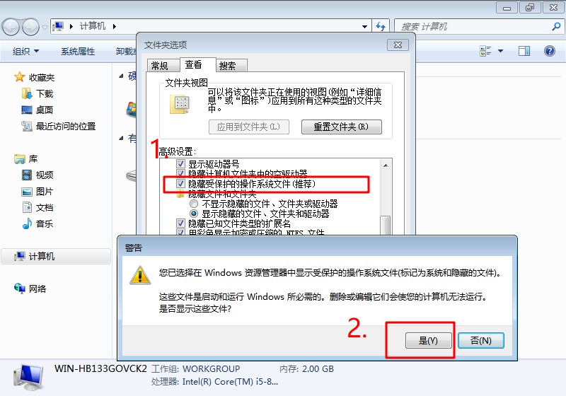3、 然后,你再重新查看硬盘容量能不能对得上,如果空间依然没有恢复,那么就参考步骤1、2,再次打开文件夹选项,点击“查看”,取消勾选 “显示受保护的操作系统文件(推荐)”,弹出警告框时,点击“是”