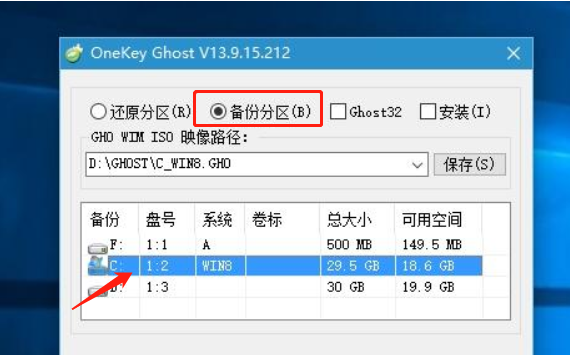 2、接着在界面中,选择备份分区,这时一般会自动生成系统备份路径,即D驱动器。之后选择C驱动器。
