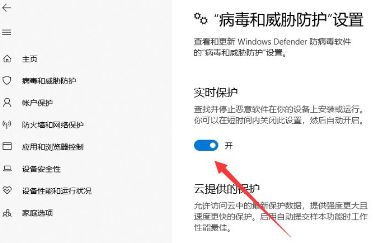 3、接着点击病毒和威胁防护的下方的管理设置,并将实时保护切换为关。