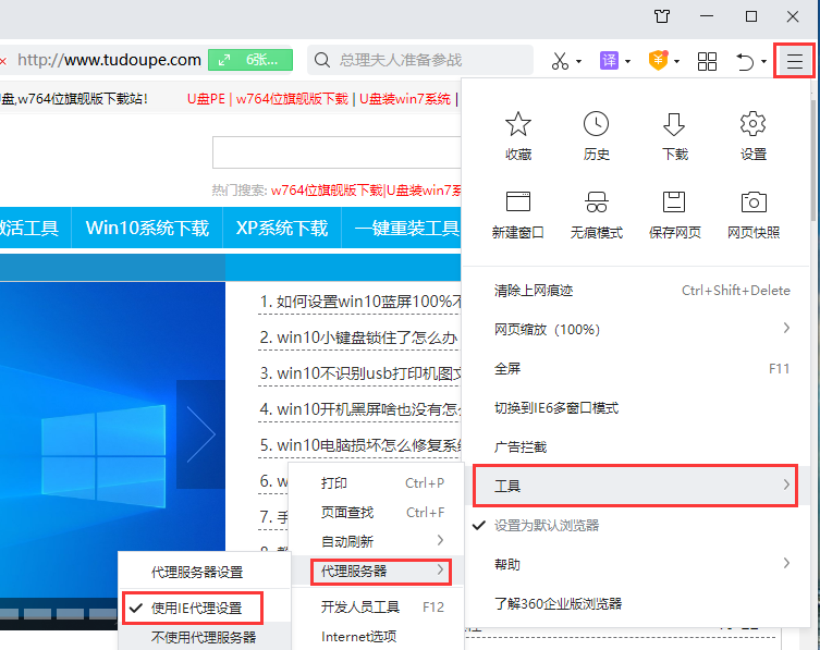 4、再次打开浏览器的【菜单】,选择【工具】-【代理服务器】-选择【不使用代理服务器】;