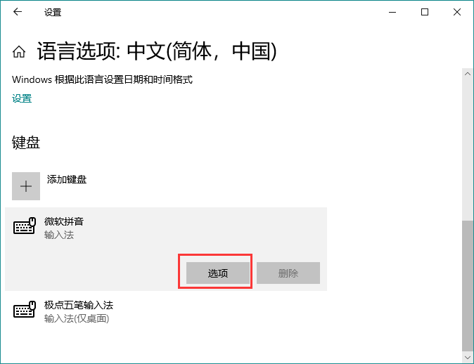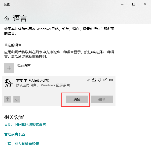 2、 在设置窗口中,点击左侧的“区域和语言”,然后在右侧点击“中文”下的“选项”