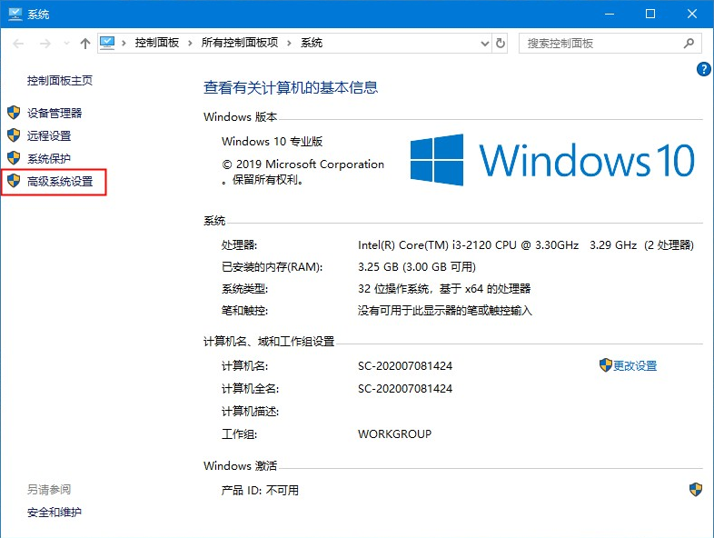 3、进入系统属性界面选择 高级系统设置。