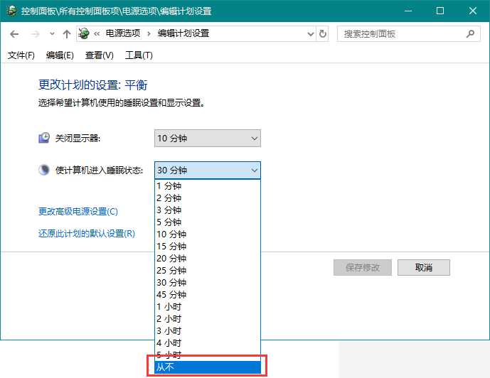 5、更改“使计算机进入睡眠状态”时间为“从不”。