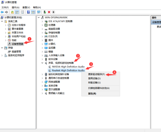 2、在设备管理器中,我们双击打开声音设备,然后在所列的硬件中击右键,选择“更新驱动程序”。