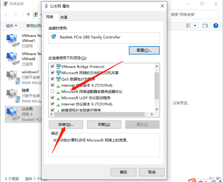 3、在网络设置对话框,找到--Microsoft网络适配器多路传送协议--选择,然后点击左下角--安装--;