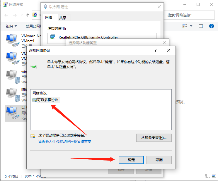 5、然后选择--可靠多播协议--,点击右下角--确定--,安装成功问题解决。