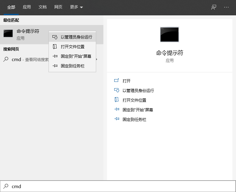 4、重启电脑。Win + S 键搜索栏输入 CMD 找到 “命令提示符”,右键以管理员身份打开,小心复制及贴上执行以下多条命令(需要联网操作,一次一行):
