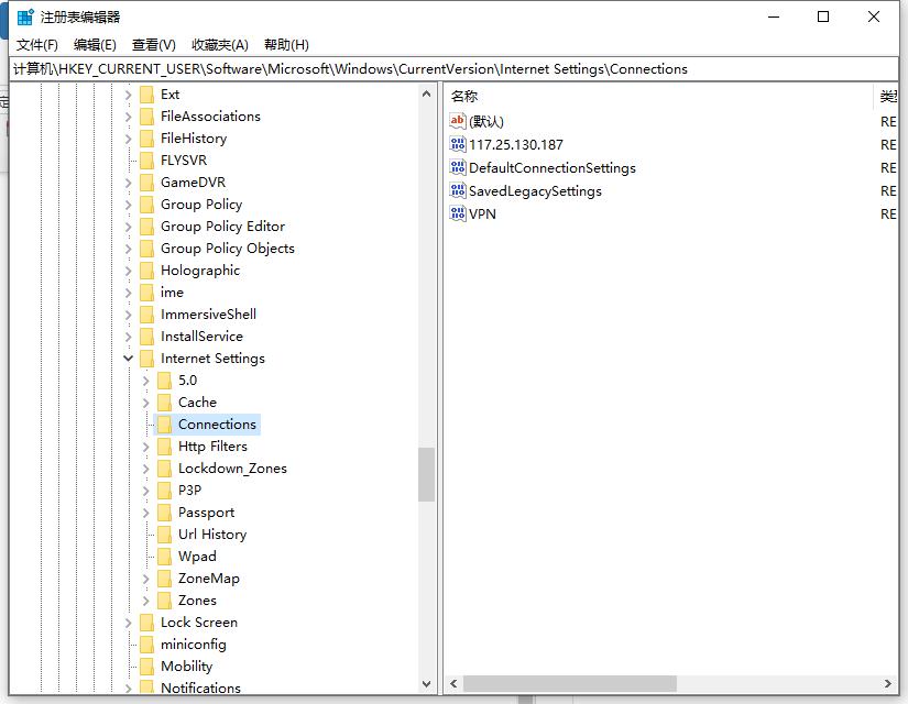2、在注册表左侧依次展开:HKEY_CURRENT_USER \ SOFTWARE \ Microsoft \ Windows \ CurrentVersion \ Internet Settings \ Connections;