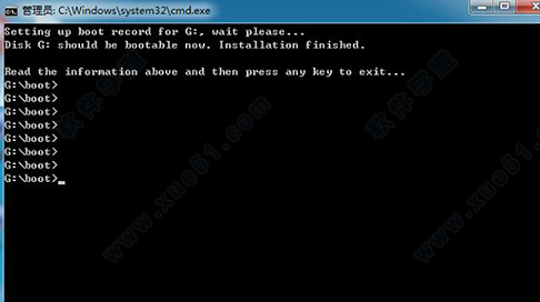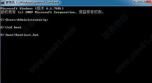 2、将其boot和BT3两个文件夹复制到用户插在电脑上的U盘的根目录下。然后点击开始-运行,输入CMD, 然后回车,进入命令行模式。首先输入你U盘的盘符,我这里是G盘,输入G:然后回车,接下来输入cd boot回车,进入到boot文件夹下,最后bootinst.bat回车,就会开始安装BT3。