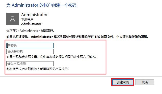 5、以下根据操作提示信息,依次输入“新密码”-“确认新密码”-“键入密码提示”,最后点击“创建密码”。