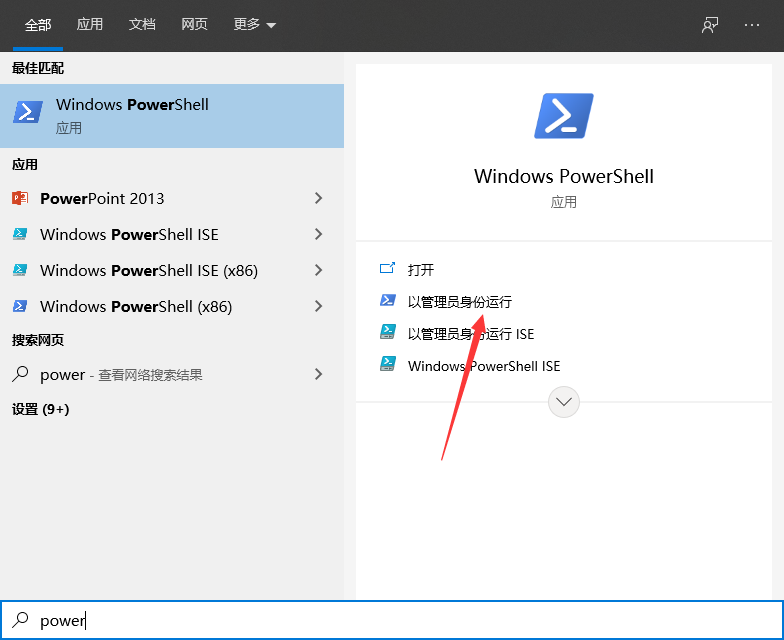 1、在电脑左下角的搜索框输入Windows PowerShell,然后选择以管理员身份运行选项。
