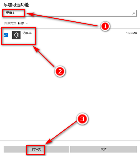 5、在添加可选功能界面,输入记事本,找到记事本,勾选上记事本后,单击安装,等待记事本安装完成。