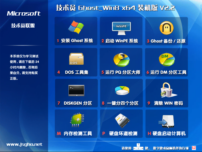 1、本系统仅用于进行演示基于万能GHOST的快速部署技术交流,或可作临时安装测试PC硬件之用。请在安装后24小时内删除,若需要长期使用,请购买正版!