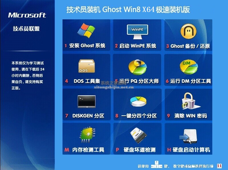 1、本系统仅用于进行演示基于万能GHOST的快速部署技术交流,或可作临时安装测试PC硬件之用。请在安装后24小时内删除,若需要长期使用,请购买正版!