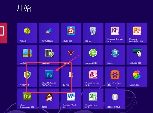 1、按“Windows键”进入Win8的“开始”界面,找到想要拖到桌面的程序图标。(这里用Photoshop来做示例)