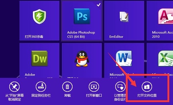 2、鼠标右键点击Photoshop图标,看到下面一行功能菜单,点击“打开文件位置”,就会跳转到 “C:ProgramDataMicrosoftWindowsStart MenuPrograms”文件夹,这个文件夹就是传统Windows“开始”菜单里面哪些快捷图标存放目录。