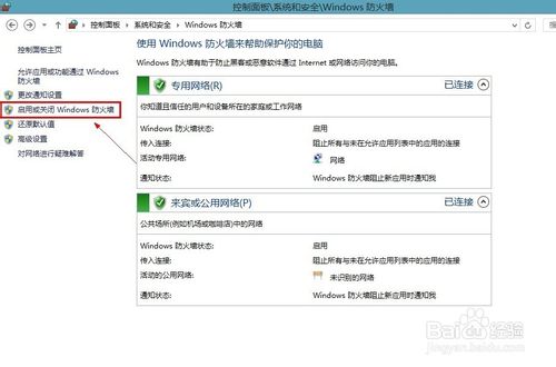 进入防火墙设置界面下找到【启用或关闭Windows防火墙】点击进入。