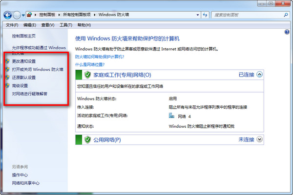 这就是Win7网络防火墙的设置界面,左边红框处可以对防火墙进行高级设置