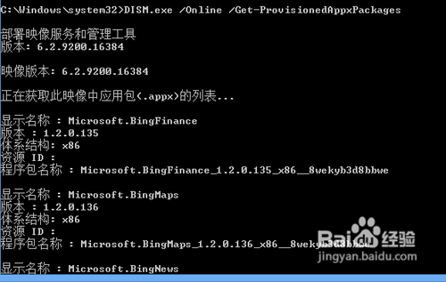 4、打开命令提示符窗口后,我们输入命令“DISM.exe /Online /Get-ProvisionedAppxPackages”(不包括引号,下同),回车,如下图所示: