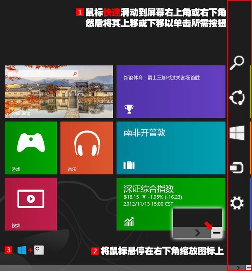 在介绍搜索功能之前,让我们先来解决一个困扰大家小问题——如何调出超级按钮(Charms Bar)。