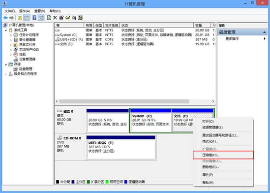 3、紧接着找到一个剩余空间较大的分区,右键单击这个分区,在弹出的菜单中选择“压缩卷”,如下图所示:
