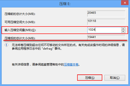 4、在“输入压缩空间量(MB)”填写需要压缩出的空间量,如果需要压缩1GB,那么就填写1×1024=1024;压缩5GB,就填写5×1024=5120;在“压缩后的总计大小”的框框中可以查看剩余容量,点击“压缩”,如下图所示: