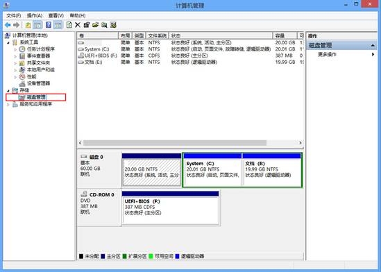 2、进入Win8计算机管理界面后,点击“磁盘管理”,如下图所示: